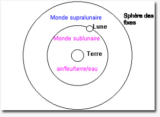 Aristote introduisit un concept - erroné - qui allait être accepté pendant près de 2000 ans, la distinction entre la Terre et les cieux. Pour lui, l'intérieur de l'orbite lunaire, ce qui incluait la Terre et son atmosphère, représentait le règne de l'imperfection et du changement. Au-delà de la Lune, ce devait être le royaume de la perfection et de l'immuabilité.
