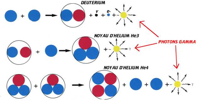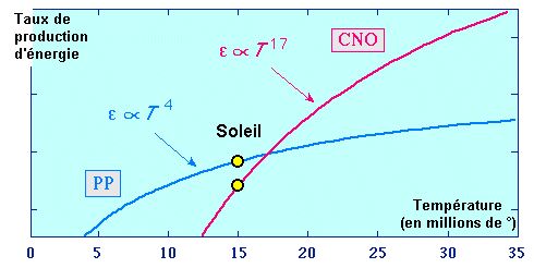 Pour le cycle du carbone, il est nécessaire de disposer d'une température interne supérieure à 10 millions de degrés. Le carbone se comportant comme un catalyseur pour assembler les 4 noyaux d'Hydrogène en Hélium4. |