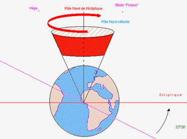 En comparant ses observations avec des plus anciennes, il découvre la précession des équinoxes due à cette inclinaison : (l’axe de rotation de la Terre effectue un mouvement conique de l'Orient à l'Occident et de révolution 26000 ans). |