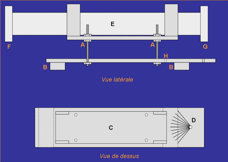 La planche support (D) est équipée d'un trou permettant la fixation au module d'acquisition. A remarquer les graduations qui permettront le réglage de l'unité d'acquisition quant à l'ordre du spectre recherché.