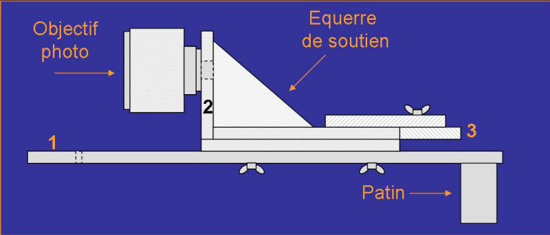 Sur cette platine, nous trouvons un support pour l'objectif photo avec son équerre de renfort, nécessaire à cause du poids de l'objectif pour garder un axe optique toujours parallèle à la platine support objectif.