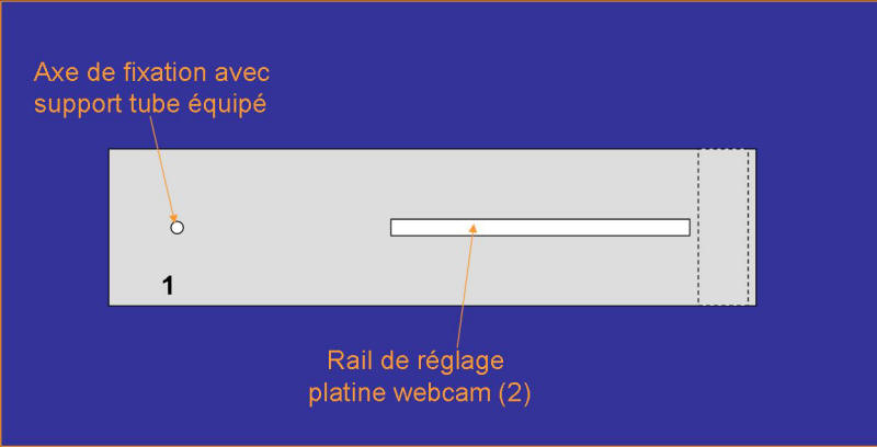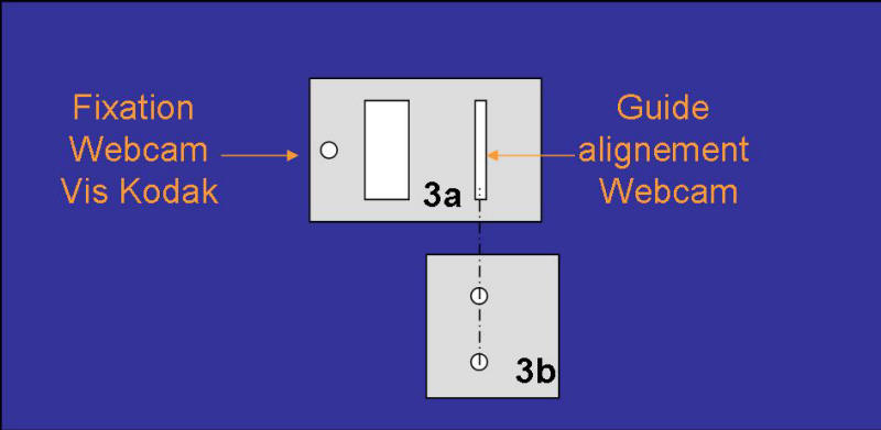 La platine support Webcam (3b) coulisse entre les rails de la platine de guidage et est verrouillée par les 2 vis traversant le rail droit. Elle supporte un autre platine qui peut coulisser latéralement sur elle pour aligner la Webcam et l'axe optique. Sur cette platine, nous trouvons la fixation au pas Kodak de la Webcam.