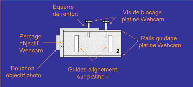 De plus, couplé avec les guides de la platine guidage Webcam (perpendiculaires à celui-ci), il permet un positionnement parfait de la Webcam sur l'axe optique.
