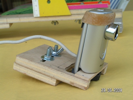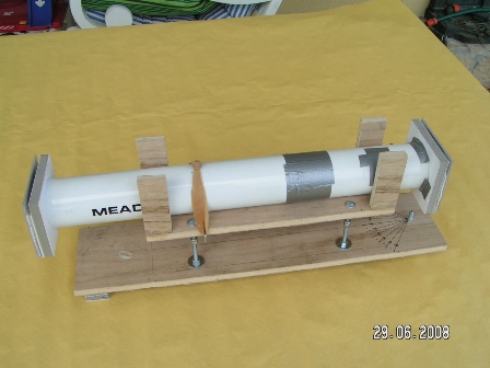 L'ensemble est monté sur une planche support (D), le module de fixation tube (C) y est fixé à l'aide de 4 tiges filetées (A) afin de permettre le réglage parfait de l'axe optique dans l'alignement de la webcam. Le tube (E) est calé entre 4 montants et fixé par des élastiques.