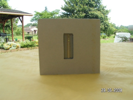 Le tube équipé (E) comprend, d'un coté une fente réalisée à l'aide de 2 lames de rasoirs fixée parallèlement (voir photo) et de l'autre coté un support de diapositive (voir photo) qui contiendra les différents réseaux que nous voudrons tester.