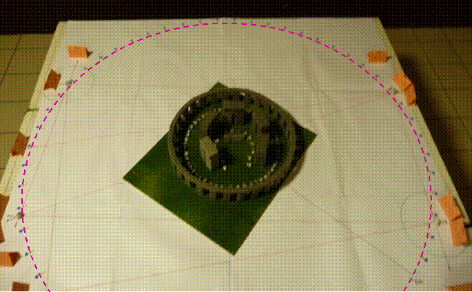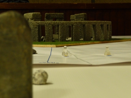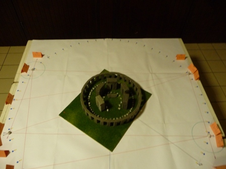 J’ai basé mes calculs sur un rapport de 2cm par mètre. Cette échelle me permettait de couvrir l’ensemble du site de Stonehenge (104m) sur une surface d’environ 4m² (soit 208cm de côté) dont la maquette centrale 60cm x 60cm (décrite plus haut) occuperait le centre. Pour résoudre le format plan j’ai jointé plusieurs feuilles de papier cartonné ce qui me donnait la possibilité de le replier sur lui-même en gardant une grande résistance sans omettre la légèreté, donc la facilité de transport.