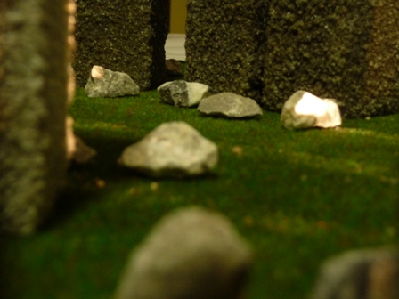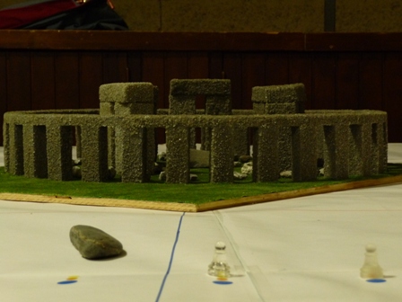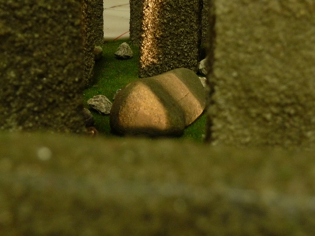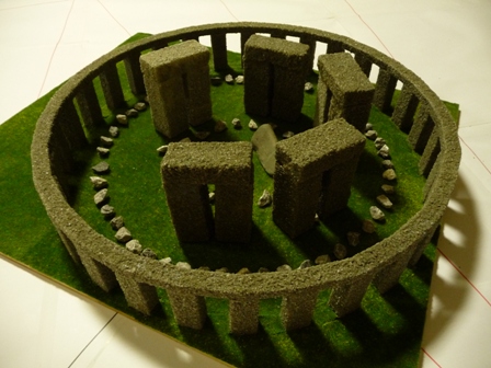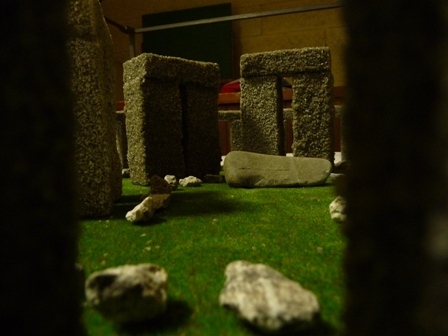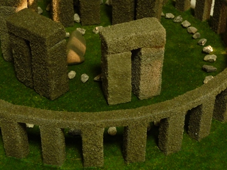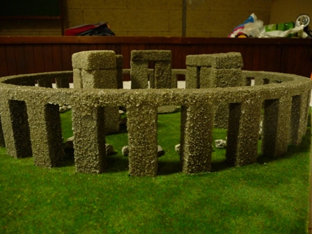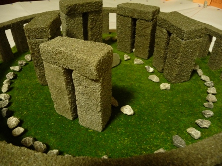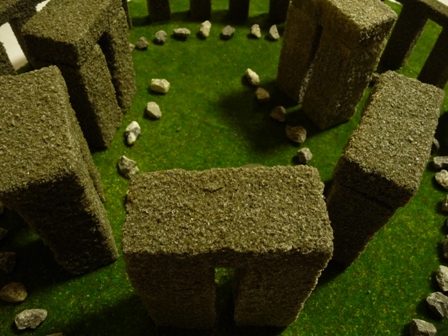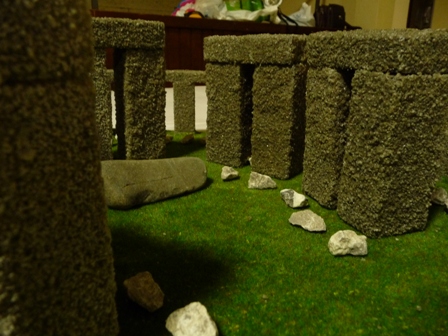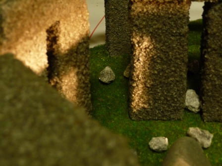 Après la phase de construction j’ai entrepris la découpe de mousse compacte pour structurer les cinq trilithes (pierres massives dominantes) en forme de fer à cheval qui encerclent la pierre d’autel.