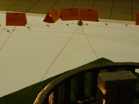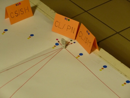 Comme vous pouvez le constater sur le plan c’est à partir des 4 stations Stones (91-92-93-94) que différents traits se croisent. Ces points d’intersections correspondent aux alignements des mouvements terrestres et lunaires par rapport au soleil. Si vous observez le plan vous verrez au bout du tracé une petite flèche pointée sur une fiche cartonnée orange indiquant la définition de la direction. |
