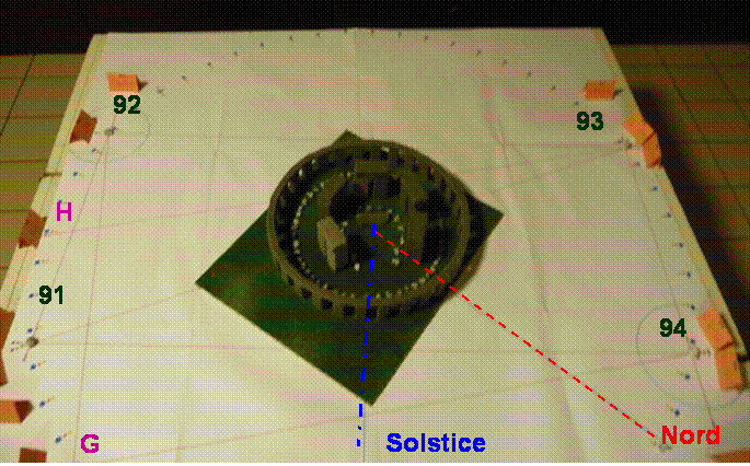 3) l’alignement du solstice d’été : droite passant par Heel Stone (pierre de référence) et le centre de la maquette Altar Stone (pierre d’autel)